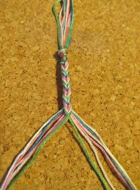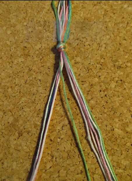 Separa las cuerdas en dos secciones iguales justo como en el pelo de alguien, que la pieza izquierda de cadena y solapamiento que a través del centro (como se muestra) y toma ahora el derecho de string a través al centro justo como usted lo hizo la izquierda. Continúe este proceso.