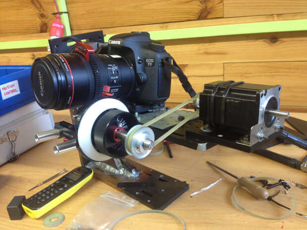Para seguir la gota en su curso hacia abajo, necesitábamos dos controles básicos: eje vertical (tilt) y el enfoque de seguimiento para el objetivo macro. Tuvimos el Control de movimiento establecido de una manera diferente, así que hemos modificado el eje horizontal para poder controlar el foco. Terminó siendo bastante feo estéticamente y el motor era demasiado grande para el propósito, pero funcionó a la perfección. Con la falta del par de flashes, que no nos permiten cerrar la persiana un poco más, y la increíblemente corta profundidad de campo para el lente de macro habría sido imposible si no mantener el foco en la gota de agua sin este ajuste.