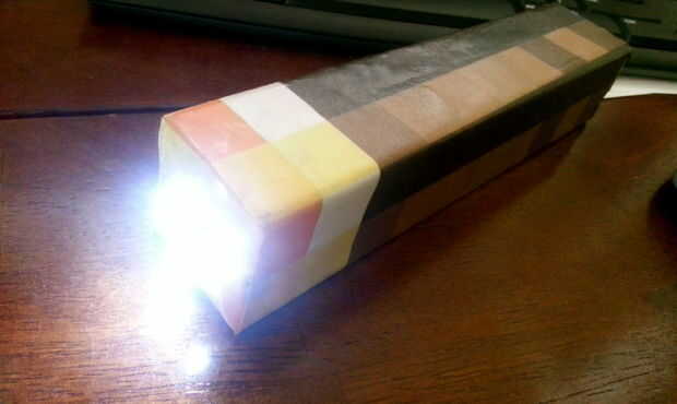 Este fue mi intento de hacer una antorcha de minecraft que realmente ilumina! En línea van por unos 35 dólares (!) así que decidí hacer uno yo mismo, usando fuentes encontradas alrededor de la casa.