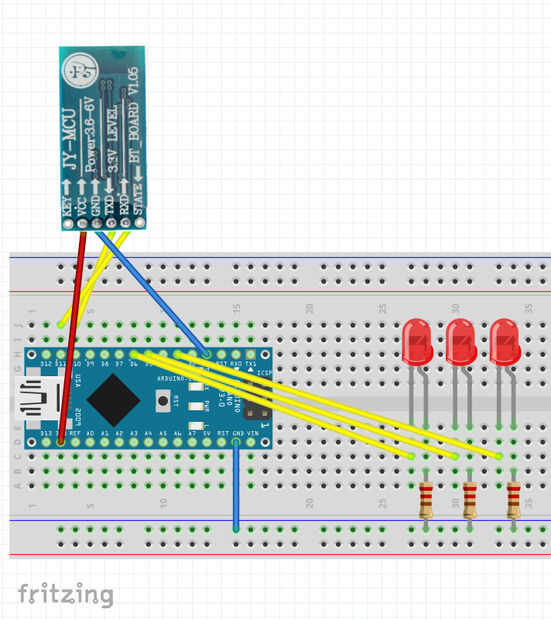 En este sencillo ejemplo controlamos unos leds a través de bluetooth