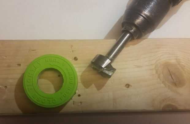 Cortar un agujero en la tapa de la jarra, tuve la suerte, el extremo del tubo acrílico fue roscado y bien atornillado en un agujero de 1 1/8"(uno de dos tamaños de brocas forstner que tengo.)