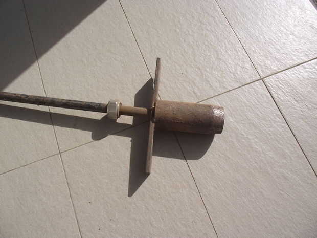 Primer corte una longitud de eje, esta longitud varía dependiendo de la altura que estás (y cuánto de la barra que logró estafar!) mina era cerca de 4 pies de largo que me dejaron sobre un pie para la manija superior.