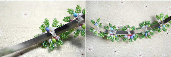 Fijar las cinco flores en la banda de pelo uno por uno, el orden depende de usted, usted puede organizar el orden como quieras. Recuerde atar el nudo en el pétalo de la flor, para que no pinchan te o puede envolver cintas alrededor de la venda del pelo primero, y luego pegar las flores con cuentas de semilla a la diadema.