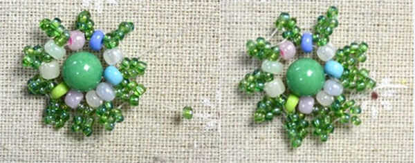 4 º, como el mismo método de un grano de semilla verde a través del cable, usted encontrará que el pétalo de la flor se hace de semilla verde siete granos ahora, continuar finalizar el resto de los pétalos;