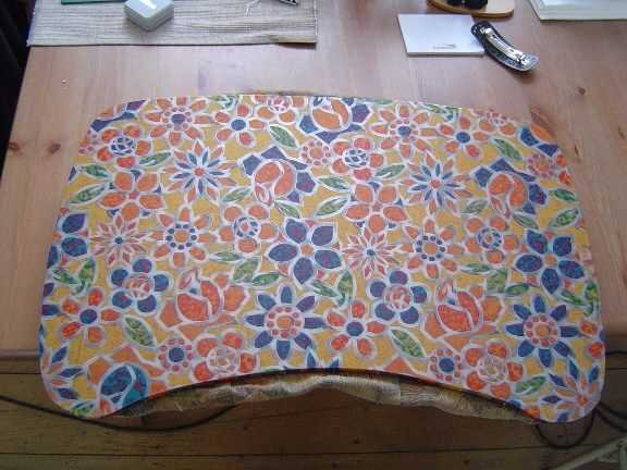 He utilizado un trozo de mdf de astillas que cuesta de 60p, un abierto un paquete de cereales para hacer una serie de plantillas, poco pegajoso con respaldo de plástico sobre la tela. El relleno está hecho de tierra hasta envases de poliestireno. La herramienta de especialista sólo es una pistola de grapas.