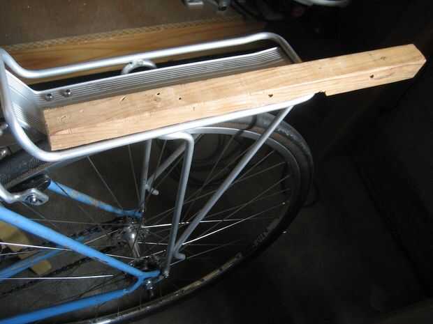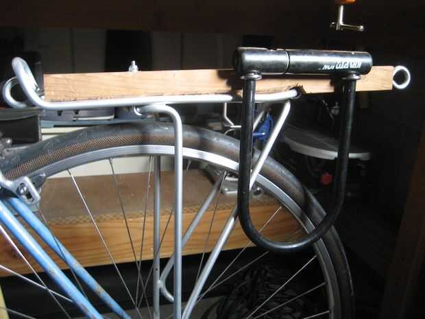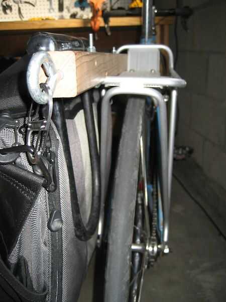 Si tienes un U-lock, añadí un lugar para montar mi bicicleta de bloqueo, que mantiene también mi bolso de balanceo en la rueda trasera. De lo contrario, probablemente tendrás que adjuntar algún tipo de enfrentamiento a su estante, por lo que su bolso no obtener aspirado y destruir su rueda o bolsa. Para mayor tranquilidad, usted puede-amarra el 2 × 2 a su estante de la bici, pero si lo hiciste bien, no tienes que.