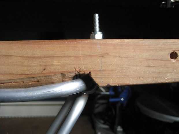 Forma de 2 × 2 para que quede alineada en su estante de la bici. La madera puede ser un poco suave. Utilicé una sierra de mano para bajar la mayor parte del material y use un destornillador como un cincel para que el resto. No van las tuercas en esto y dejar tanto material como sea posible. Sólo trate de asegurarse de que no hagas afiladas esquinas o puntos débiles, porque no quiere su bolsa al caer de su bicicleta, si la madera se rompe.