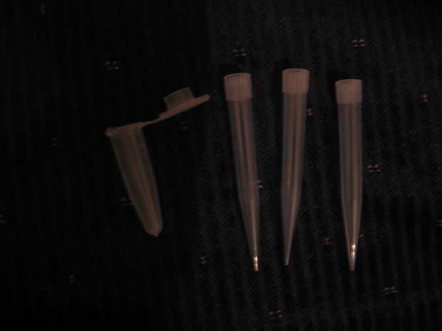 En este caso he utilizado un tubo de eppendorf de 1,5 mL y 3 pipetas de 1 mL. Puede utilizar a cualquier tipo de tuberías como sigue la regla de dibujo (intro). Para pegar las piezas utilicé una pistola de pegamento y para sujetar la bomba a la llave, utiliza la manguera de plástico que cabe a las puntas de pipetas y un pedazo de un tubo de bicicleta.