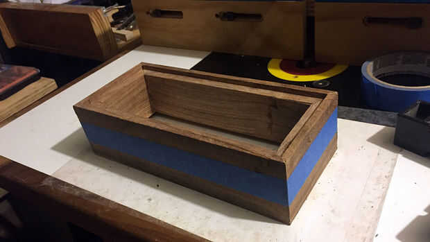 Utiliza una tira larga de cinta de enmascarar azul para contener las piezas de lugar, agrega el pegamento y cuadrado todos, después de un par de horas que había una forma de caja para los próximos pasos.