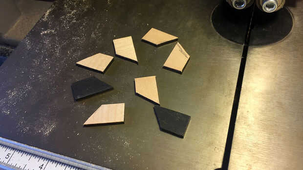Tuve algunas sobras de ébano de un cabezal de guitarra que hace un par de años y alguna chapa de arce, ambos pegan y luego cortadas pequeños pedazos en la sierra, la pieza sobrante de madera era pequeño así que tuve que ser un poco creativo para obtener las 8 ranuras necesarias.