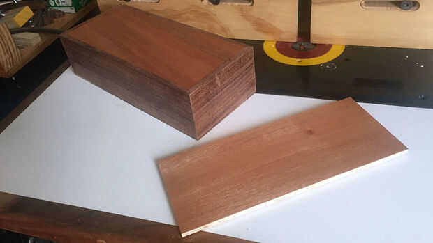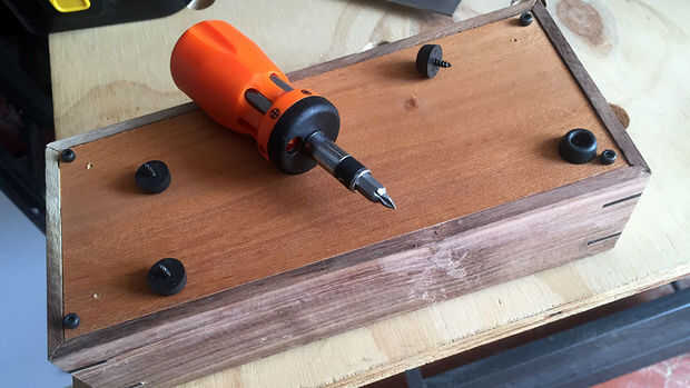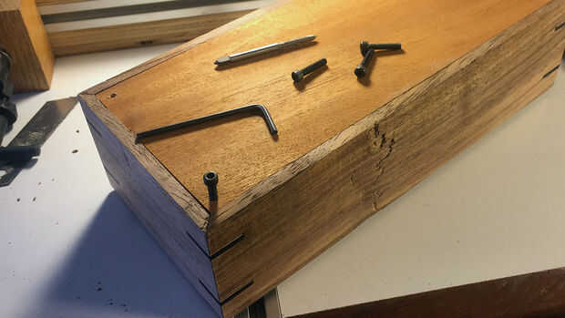 He utilizado la lijadora de disco para la arena a la madera extra hasta las piezas superior e inferior tenía un buen ajuste, entonces utiliza un grifo de 1/8" para hacer roscas en los lados, como la madera de tzalam es dura, que sostiene los hilos de rosca finos bastante bien.