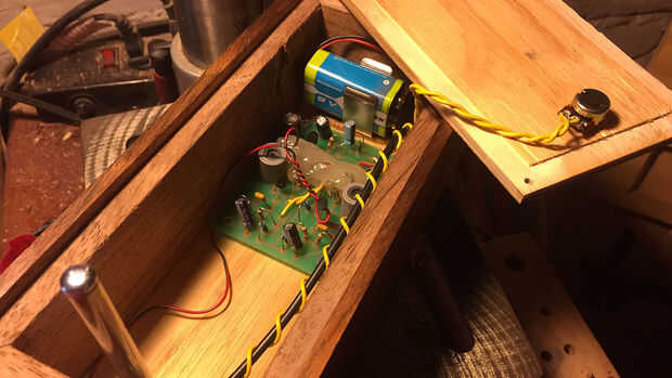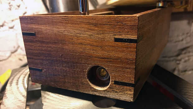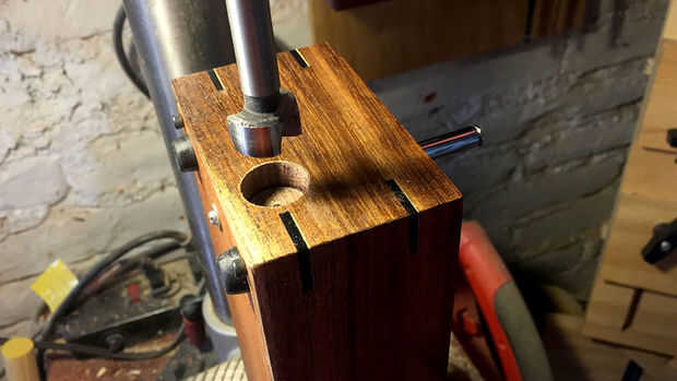 El kit de theremin utiliza un 9 voltios Batería así que era el único acceso es necesario para la salida de la toma de audio así que la caja para el taladro con un 3/4" forstner poco perforado lejos lo suficiente como para el hilo de toma de corriente tener buen espacio para tomar la tuerca y perforado a través de todo el camino con una broca de 9mm.