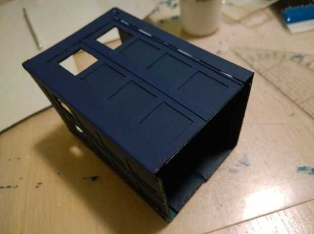 La base de los paneles de la TARDIS está hecha de un cartón corrugado fino para la fuerza, con el grano corre verticalmente. Kiki usa cartón de alguna caja de Ikea; Usted también puede usar una simple caja de cartón vieja, pero puede necesitar cortar los paneles de base ligeramente más estrecha para compensar el grosor adicional.