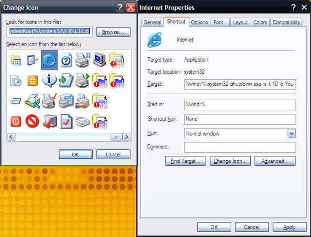 Ahora haga clic en siguiente y asígnele el nombre Internet Explorer o Mozilla Firefox o cualquier nombre de los iconos que se enganchen y uso mucho. Terminarlo y luego ir a y haga clic derecho. Seleccione propiedades y vaya a la pestaña de acceso directo. Haga clic en el icono de selección. Elija el icono de Internet Explorer (debe ser en el espalda if usando XP). Aplicarlo y ahí lo tienen. Una vez que la víctima hace clic esto, repetidamente se reiniciará su computadora. ADVERTENCIA!: el equipo mantendrá reiniciar y voluntad no pare. Repito, no parada. Para terminar con esto, cuando su (o el suyo para ver si esto funciona) computadora comienza arriba, pulse F3 o F2 (recuerdo cual) y entrar en modo seguro. Una vez en modo seguro, borrar el acceso directo. Entonces su hecho. Y si desea apagar su ordenador una sola vez, reemplazar - r - s. Se apagará el ordenador cada vez haga clic en él, sin reiniciar.