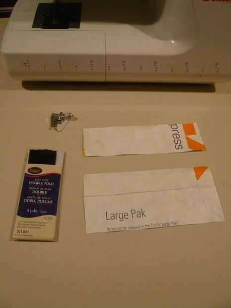 4. Cortar tres tramos de aproximadamente 8 1/2" de cinta de bies.  La medida no tiene que ser exacta, pero que desea que cuelgue sobre el borde de su material así que coge la máquina de coser.