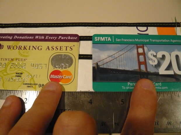 - Colocar dos tarjetas de crédito en los bolsillos y marcan un periodo de 1/4" en el centro a lo largo de la parte inferior de los bolsillos