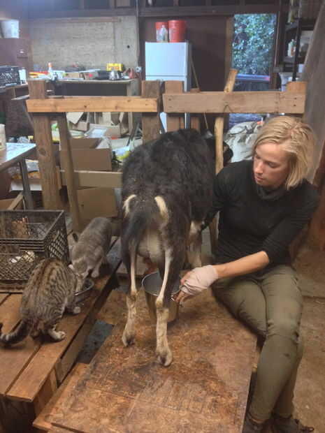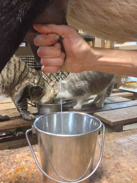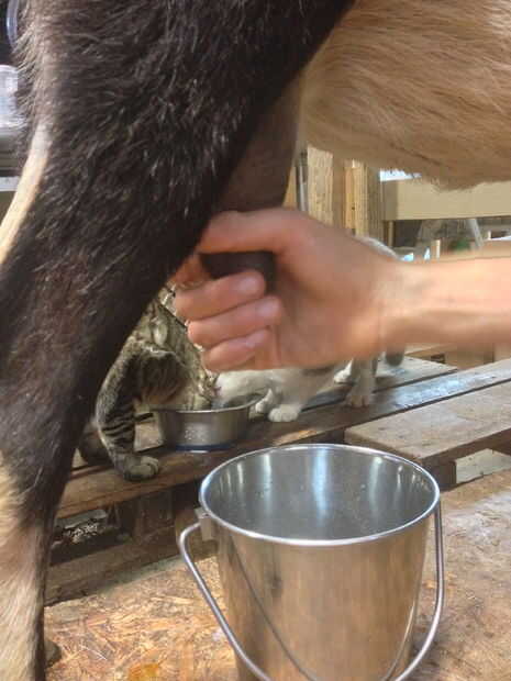 3. lo de la leche!: este es el pan y la mantequilla de toda la operación. Mientras que la cabra es la alimentación, puede agarrar la teta y utiliza el pulgar y el índice para atrapar la leche dentro. Exprima suavemente, mientras empuja hacia arriba. No tire del pezón hacia abajo! La cabra se enojan y estirar la pata. Relajar su puño y dejar que la leche relleno en la tetina para la siguiente ronda. Repetir.