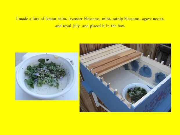 hice un señuelo de bálsamo de limón, flores de lavanda, menta, flores de hierba gatera, néctar de agave y jalea real. Puré los elementos juntos y lo colocó en el cuadro.