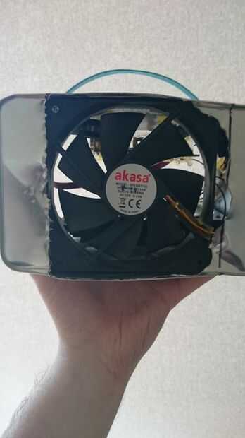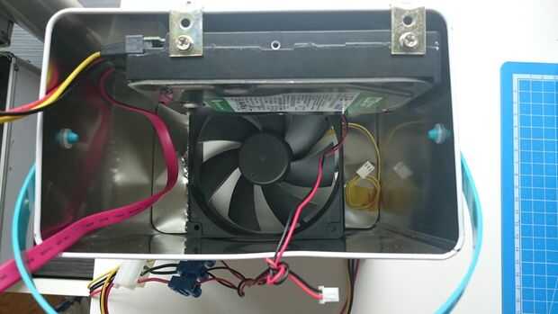 El disco duro montado en la caja usando L-brackets. Hay un ventilador de 120mm en la parte inferior y la parte inferior aproximadamente de corte usando un taladro y alicates. Se recomienda el uso de tijeras, mina no estaba alrededor en el tiempo.