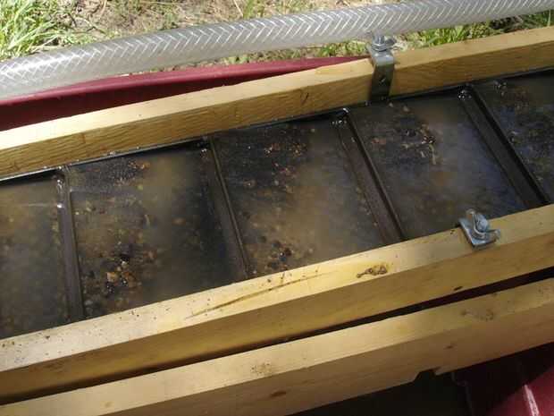 La segunda foto muestra la compuerta después de funcionar por un tiempo. Sobre todo está lleno de arena negra, con unas rocas al azar. Así lo está haciendo lo que se supone que debe para hacer y es separar los minerales pesados de la mayor parte del material.