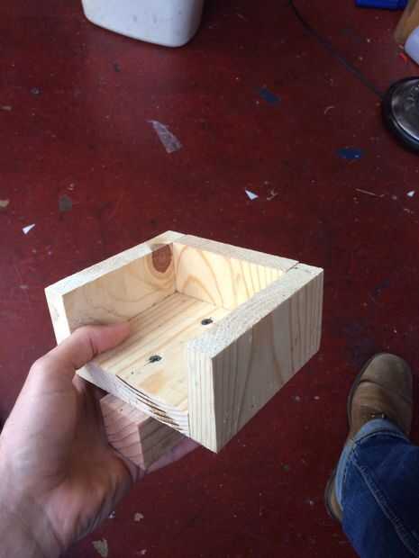 Construir minas en corte de madera de desecho en la Sierra de mesa. Hice los lados ligeramente más baja que el cubo de la mitad es alto, tan cerca de 1.75". He construido sólo un pelo más ancho que mi cubo por lo que le cabe tanto como sea posible sin mucho espacio de maniobra, aproximadamente 1/16" de más en cada dirección. Quedó una cara de las paredes por lo que yo podía fijarlo con la abrazadera en más adelante para comprimir el bloque en la plantilla, todo lo rígido manteniendo. Una tira de madera se atornilla en la parte inferior de la mordaza agarrar a.