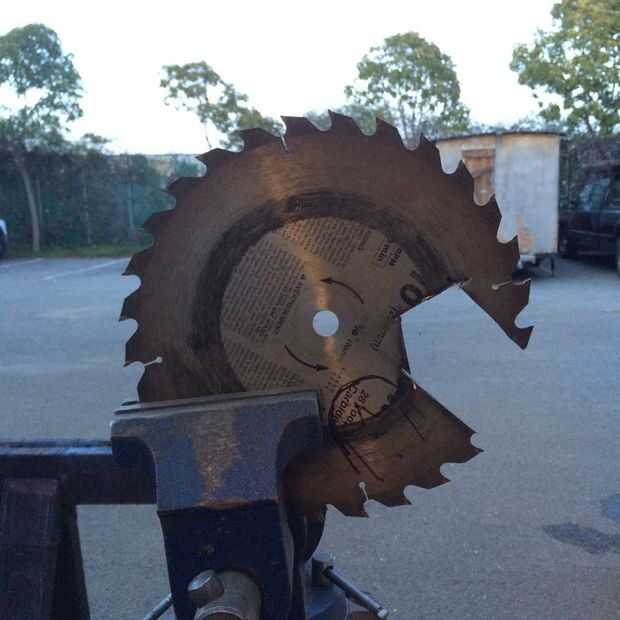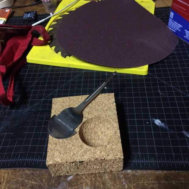 Decidí que era tiempo de tomar en serio-que necesitaba una herramienta de garantía de vida útil y capacidad de repetición. Decidí construir una punta de la pala personalizada con mi radio 1". Usando el disco de corte en una amoladora de ángulo me quitan una sección de un viejo usado vio hoja - acero herramienta templado. Con la misma amoladora cortar el extremo de una pala de 1 1/2" broca y entonces tierra de estas piezas planas y áspero cuadrado en la lijadora de disco. Con un compás dibujó mi radio 1" en la sección de corte de la sierra y después soldado con autógena dos pedazos como centrado y cuadrados como sea posible. A la lijadora, triturado a la línea de mi radio dibujado. A continuación, configurar un ángulo de la amoladora de banco para moler en un ángulo de alivio a cada lado, superpuestas en el centro. Sin demasiado trabajo yo tenía un filo semi-fiar mirando! Todo esto por el ojo, lo hice el proceso no fue perfecto, pero no me imaginé me enseñaría si yo estaba en el camino correcto, mejor caso peor realmente podría funcionar! También pensé que era a mi favor que el corcho es tan suave.