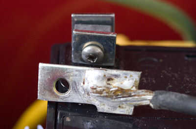Si el inversor no se potencia más de 1000 vatios de luces estroboscópicas sin pitido, desoldar las pinzas de la batería y tratar de conectar directamente los cables a los terminales con tornillos y arandelas. Emplee dos roldanas en cada terminal para evitar que el perno siendo tirado a través. Corte los extremos de un 2 1/2" abrazadera esquinera hace arandelas cuadradas muy fuerte. En el futuro podría tratar de usar el cable de un par de cables de puente viejo para ver si hay cualquier amperios se gana con un conductor más grande.