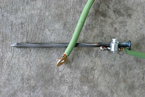 Lata los extremos de una 8 calibre de cable. Soldar un extremo con una arandela de latón y abrazadera de manguera, el otro un clavo grande o una espiga. Eléctrica con cinta la conexión de la abrazadera de la manguera y la arandela del perno en el soporte de ángulo izquierdo 3".