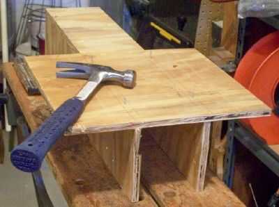 Corte y pegamento, un pedazo de madera contrachapada de 12 x 12 pulgadas sobre la parte abierta de la caja "U". Se trata de la tabla en la que la sierra se mueve.