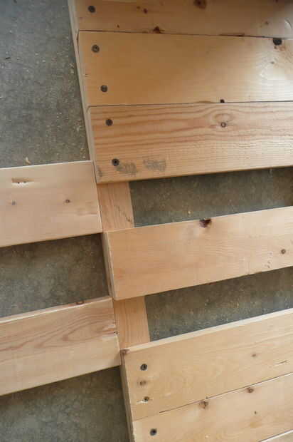 Usando mi mesa Sierra, arrancó el 4 piezas largo por la mitad y cortarlas en 4 longitudes de 30" y 4 longitudes de 22". Utilizando dos de cada longitud, dispuestos les en dos rectángulos (que yo llamo aros porque es como hacer un barril rectangular). Utilicé tornillos recuperados para sujetar los aros.