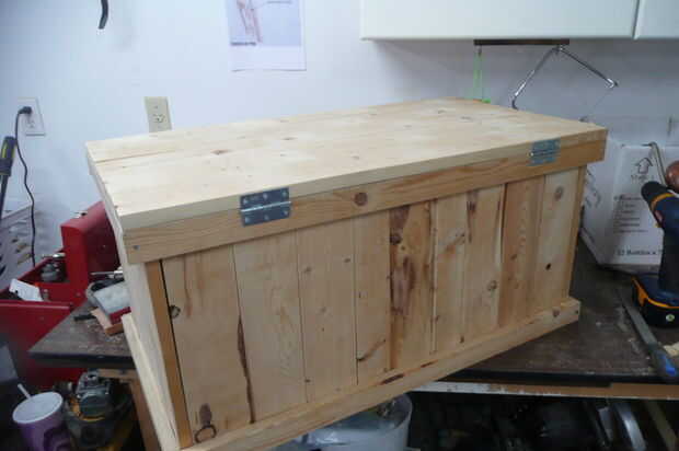 OK, no del todo. Quería una manija de la tapa que no sería incómoda mientras está sentado en él. Decidí perforar un par de agujeros en la plancha frontal y luego, después de aplicar el acabado, un pedazo de cuerda a través de.