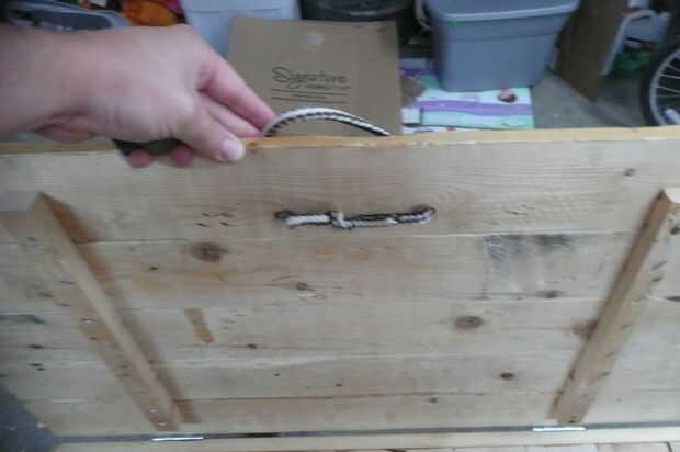 Para la aplicación y el secado, me puse la caja en la parte superior un par de tipo pyrex cassarole platos que había rescatado para que el acabado no se pegue a él. Una vez seco, me empuja la cuerda por los agujeros y ató los extremos por debajo de la tapa. Mi esposa piensa que la cuerda es muy fea y me quiere usar algo más. Mantengo mi ojo abierto para un mejor trozo de cuerda.