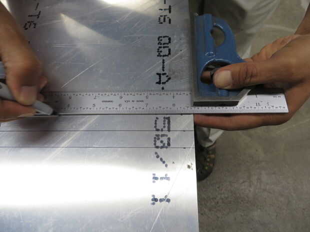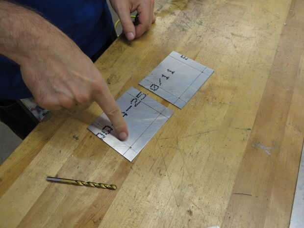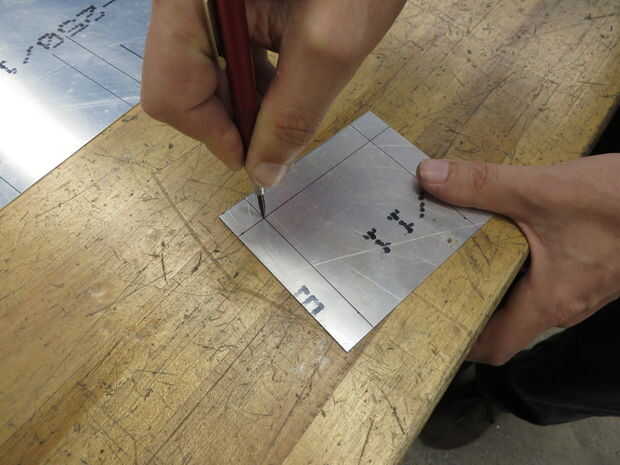 Donde se intersectan las líneas, utilice el punzón de metal con resorte para poner hoyuelos en el metal. Aquí es donde se perfora, y la depresión ayuda a evitar que la broca de vagando por.
