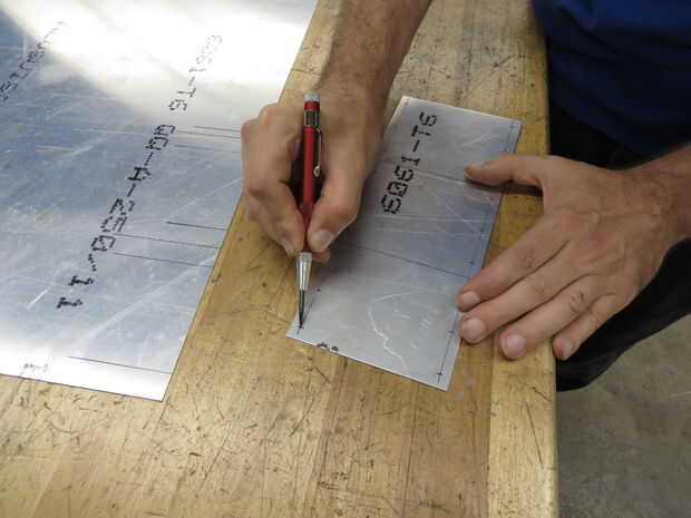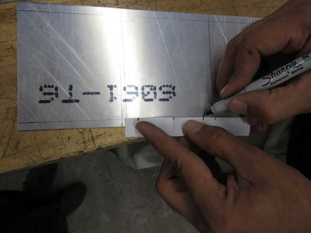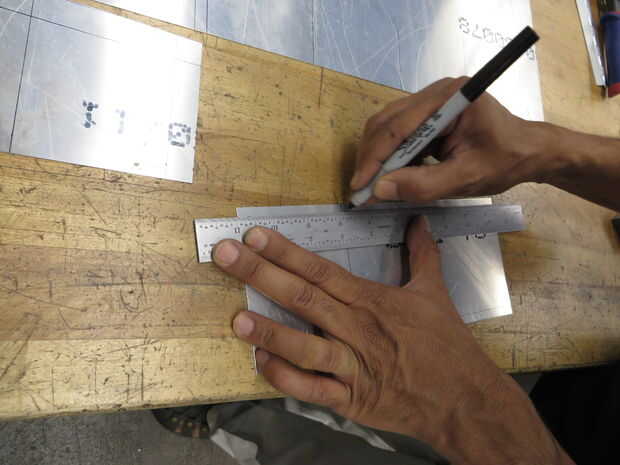 Haga una plantilla de papel con tres líneas, cada 1" unos de otros. Uso la plantilla para marcar remache orificios en cada sección a lo largo de las líneas de largo, por lo que es de la marca media de la plantilla en el centro de cada sección.