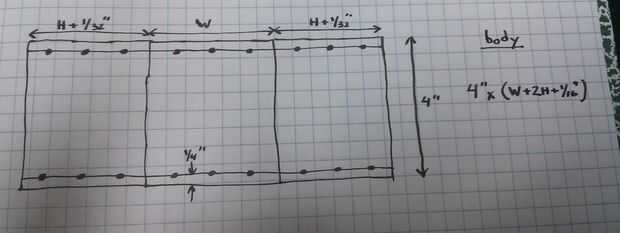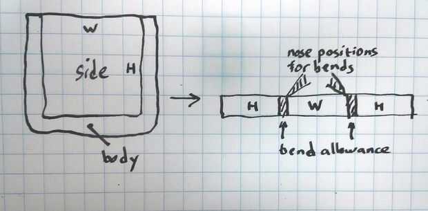 El diagrama siguiente muestra cómo se revela un lado, incluyendo su asignación de curva. Así que lo que necesitamos es una pieza de metal que es 2 x H, además de W, más 2 x doble asignación, sea lo que sea. Hay calculadoras en la web, pero sólo tiene que utilizar 1/32" para ahora, que trabajó para mí. Si funciona para ti, genial, si no, puede cortar otra hoja y vuelva a intentarlo con una prestación diferente.