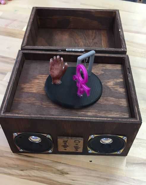 Construimos una caja de música que tocó "Purple Rain" de Prince, "Wrecking Ball" de Miley Cyrus y "Single Ladies" de Beyoncé. La caja se abre para revelar un 3D carrusel impreso en él que tiene el símbolo del príncipe de amor, una bola de demolición en ella, y una mano que corresponden a las canciones que teníamos jugar. En el interior de la caja, hay un Raspberry Pi que controla las canciones tocando y el movimiento del carrusel, y en el exterior se encuentran cuatro interruptores, uno para cada canción y hacer el giro de carrusel.