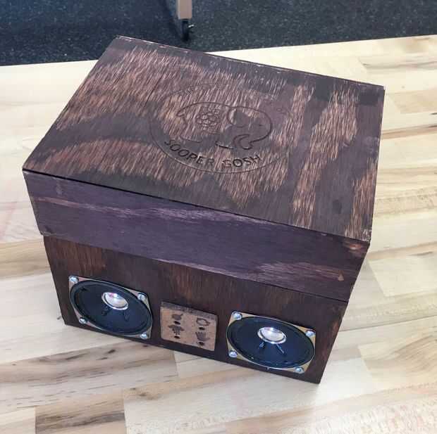 La tapa fue hecha exactamente igual como la base excepto las dimensiones eran 8x6x2in. En la parte superior de la tapa, laser grabado el logo de nuestro equipo. Usted puede hacer lo mismo si tienes acceso, pero no es necesario. La tapa fue unida a la base por una bisagra, centrada en la parte posterior. Nos manchó toda la madera de un marrón oscuro.