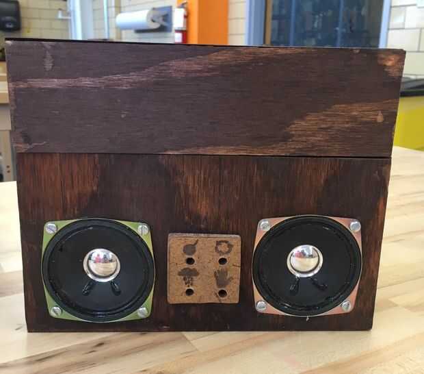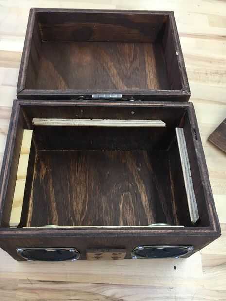 La base de la caja estaba hecha de cinco piezas: dos para los lados eran 4x6in, dos para la parte delantera y trasera eran 4x8in, y la parte inferior era 6x8in. La mayoría de los cortes se hicieron en un ángulo de 45 grados con el fin de hacer las costuras más suave a excepción de los que serían tocar la tapa (uno de seis pulgadas de borde en cada lado y un borde de seis pulgadas en las piezas delanteras y traseros). Cortan los agujeros en la pieza frontal para dar cabida a nuestros oradores y switches que utilizamos. Estos variarán dependiendo de lo que usted tiene disponibles para usted, pero no son difíciles de hacer. Los cinco pedazos entonces se pegan para formar un cuadro que fue 8x6x4in con ningún superior.