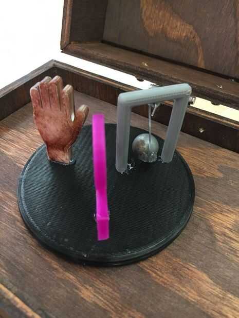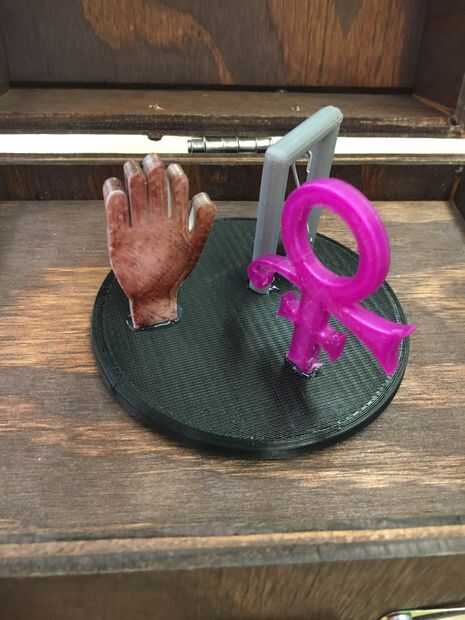 Esta parte es realmente suya en lo que usted desea poner en él. Hemos hecho una mano, símbolo del príncipe de amor y una bola de demolición debido a las canciones que decidimos jugar y tuyo puede ser lo que quieras. Primero imprime la base que era simplemente un 5 en que todas nuestras piezas entonces fueron pegados a la rueda. La base fue entonces atada a nuestro motor de servo.