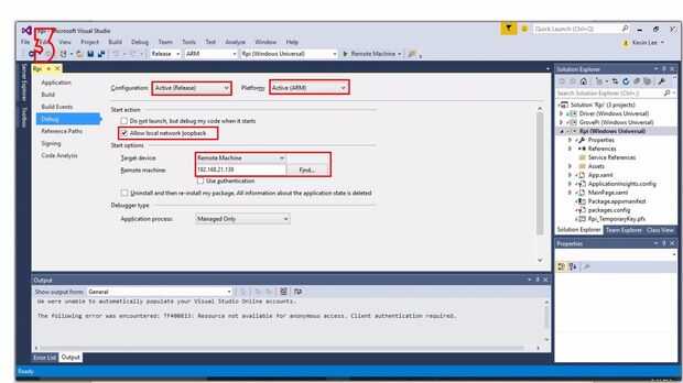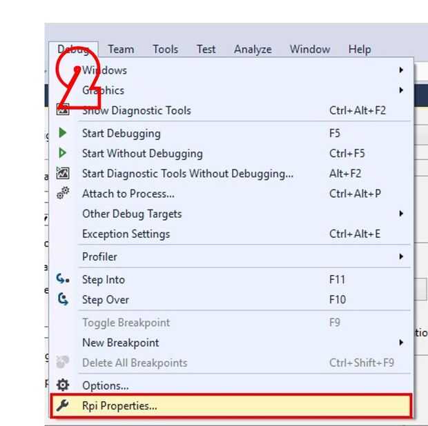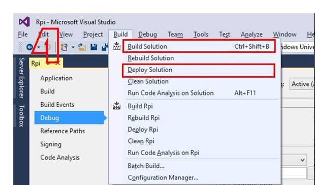 Haga doble clic en el "Rpi.sln". Entonces encontrarás que hay 3 proyectos en el explorador de soluciones. Elegir el proyecto "RPI (Windows Universal)", haga clic en "Depurar" -> "Propiedades de Rpi" como se muestra en la imagen 2.