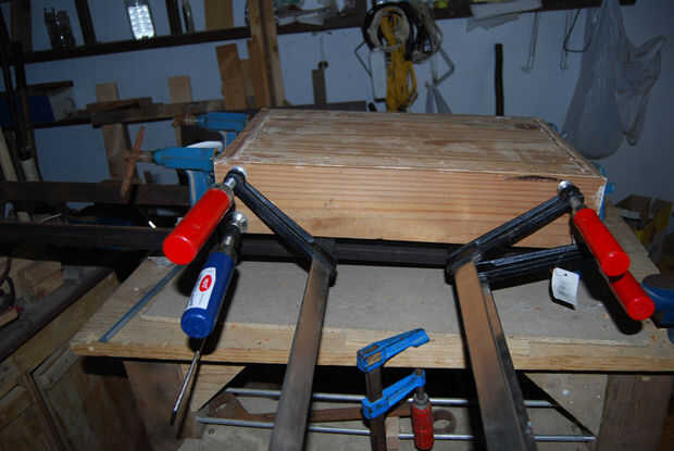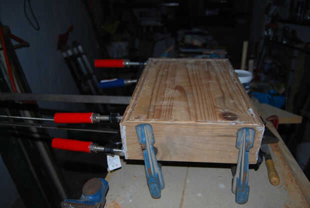 Primero hay Donalda las tablas. Al ser machiembradas, hay eliminar alguna parte de la Unión. En la base y la tapa, unimos las tablas machiembradas, encolandolas. Las tablas formaran los laterales, se cortan a medida, y los ingletes. Se encola todo y se sujeta con sargentos. Tambien se atornillan las uniones que lo permiten.