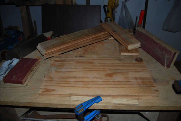 Los defectos de la madera mas feos, se tapan con masilla. La masilla la hago con cola y serrin. Despues se lija, pero de forma superficial, no quiero un acabado fino.