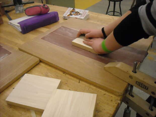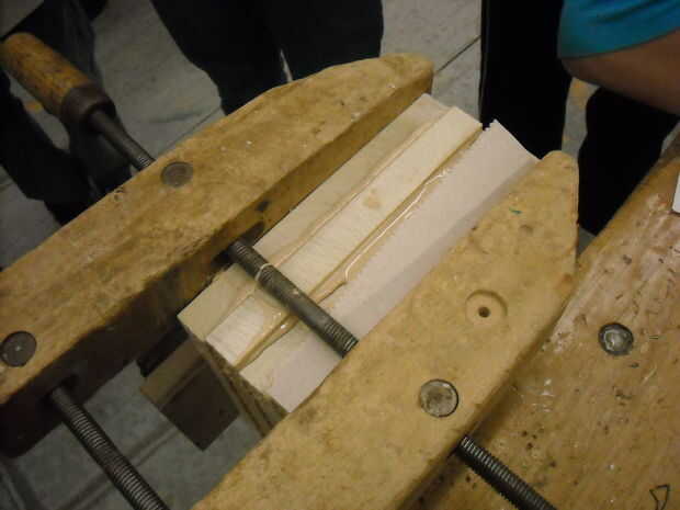 Pegamento de la madera, sujete bien y dejarlo a sentarse. Asegúrese de que los niños de la abrazadera alrededor del perímetro... He notado que los niños a menudo serán sólo de la abrazadera en el medio y dejar que se seque sin garantizar una articulación estrecha todo el camino alrededor de la manzana. Incluso he tenido niños cortar y pegar con cuidado de dejar que se seque en el centro de la mesa... liberado...