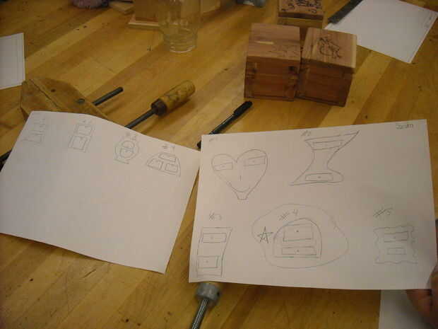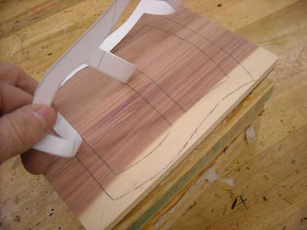 Trazar la parte delantera de diseño en un pedazo de madera delgada de contraste. Pegar sobre el bloque que se ha hecho ya. No pegamento en la parte posterior en este momento.