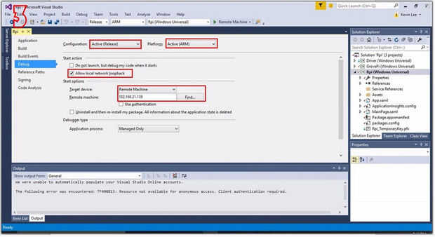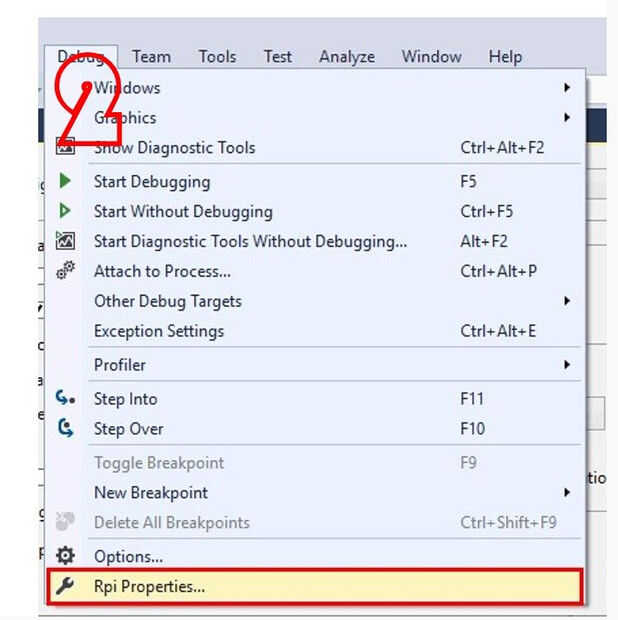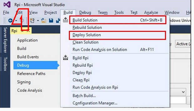 Haga doble clic en el "Rpi.sln". Entonces encontrarás que hay 3 proyectos en el explorador de soluciones. Elegir el proyecto "RPI (Windows Universal)", haga clic en "Depurar" -> "Propiedades de Rpi" como se muestra en la imagen 2.