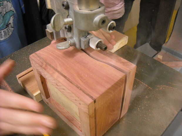 Una vez que las cajas son lijadas y acabadas usted puede cortar la parte superior. Mostrar a los niños cómo dibujar un estirados "S"... Echale un vistazo a las fotos. Demo el corte en la Sierra de cinta, pero estoy abierto a hacer este paso para los niños... puede ser que un poco un corte complicado y los niños realmente puede destruir sus cajas en una prisa. Asegúrese de que la cuchilla está muy afilada. No cortar la pieza superior o terminarás con un gong sólida tira a través. Asegúrese de que el corte no caiga demasiado lejos en la caja o perderás todo de la profundidad de la caja real.