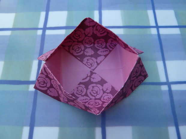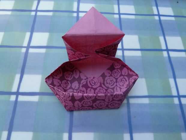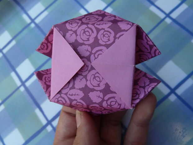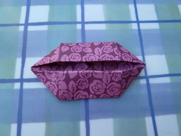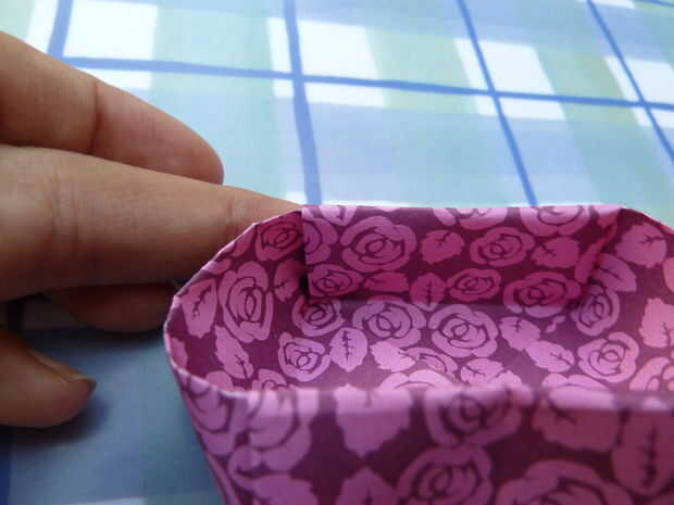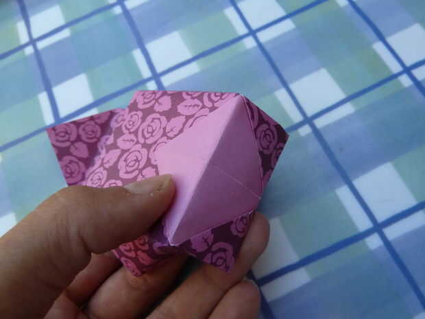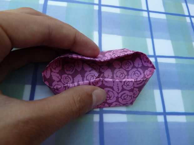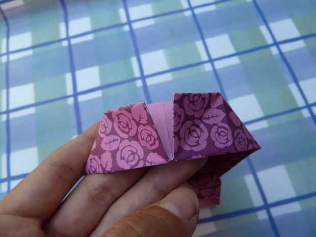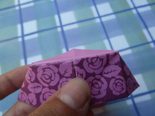 En el doble de los lados, que se muestra en las fotos, tomar el triángulo y doblarlo para que esté recta. Repita en el otro lado. Invierta el doblez como se muestra en las fotos.