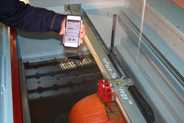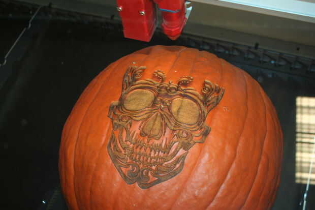 Ajustar la configuración. Tienes que utilizar más energía para obtener un bonito grabado profundamente en la calabaza. También, tener el láser graba desde abajo hará más fácil de limpiar después. Enfocar el láser, luego pulsa start.