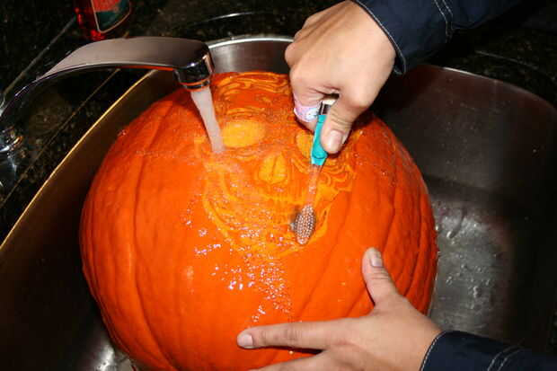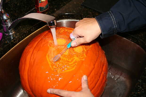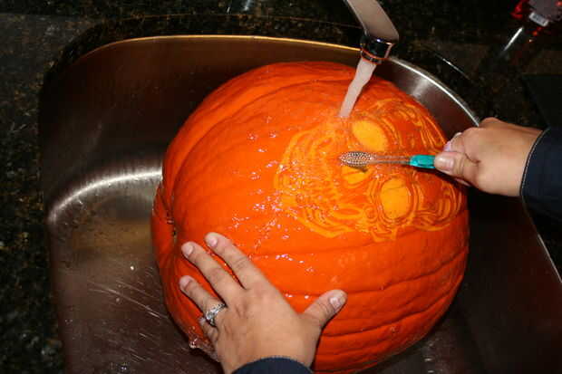 Una vez finalizado el grabado, retire la calabaza el láser. Limpie el grabado con agua y un cepillo de dientes. Puede sellar el grabado con vaselina para evitar que los bordes de deshidratación o descomposición demasiado rápido. Asegúrese de que usted tome algún tiempo para limpiar a fondo tu laser, grabado de calabazas puede conseguir desordenado!
