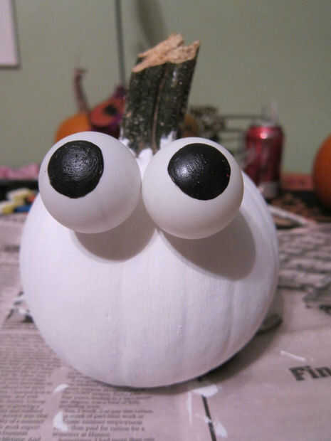 Sólo añadir un poco de pegamento caliente a la parte posterior de los ojos y coloque en la calabaza.